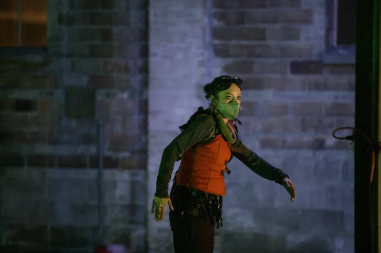 Multi-instrumentalist composer JG Everest performs his original score live on stage, a hybrid of electronic, acoustic and site-specific found sounds. Randy Kramer’s stark video design enhances the sense of loss and disorientation with “grass so green it makes your eyes hurt” and Heidi Eckwall’s scrappy guerilla lighting sets mobile boundaries through which the dance unfolds.