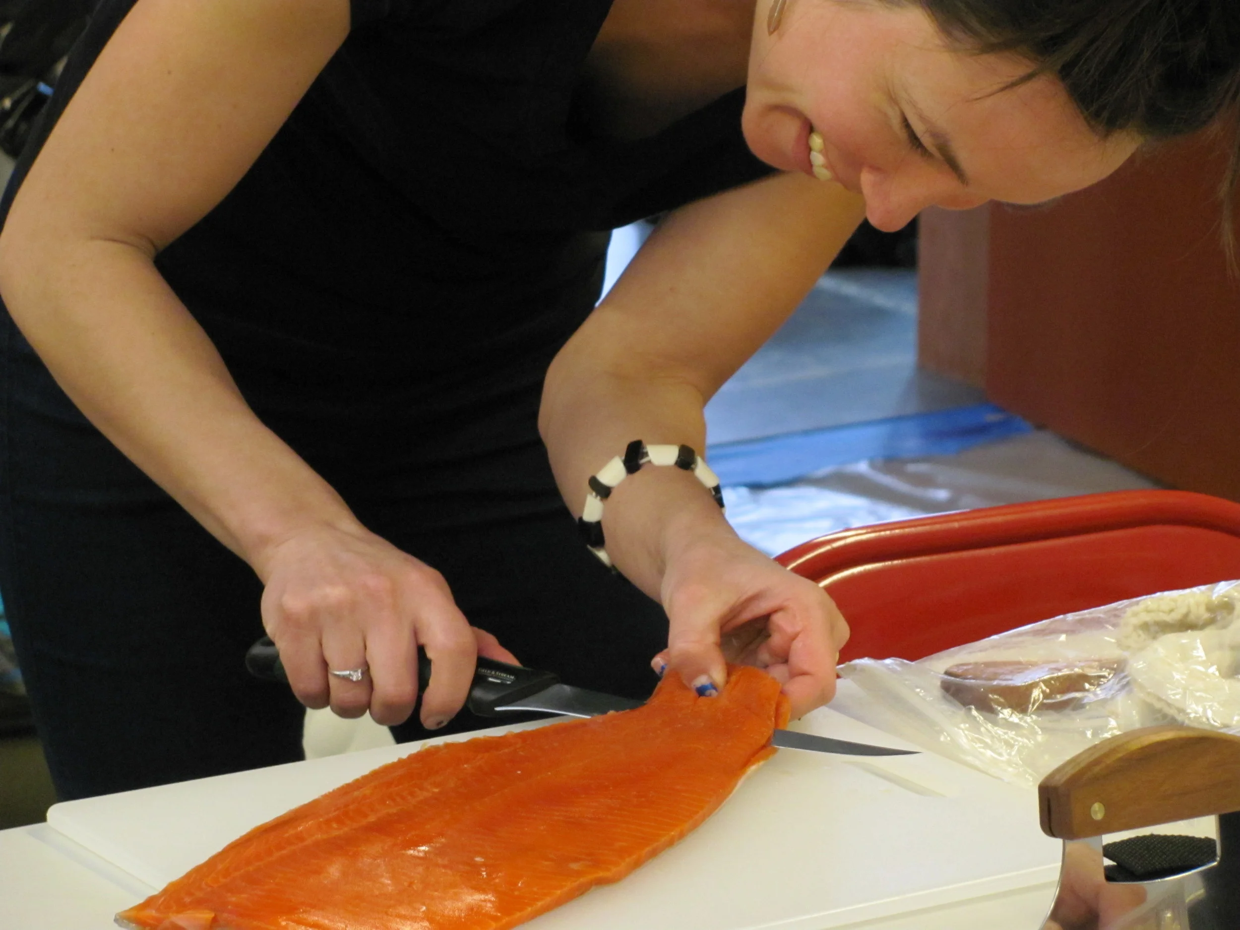 As part of the long process of creating Niicugni, Emily studied the traditional craft of fish skin sewing with Alaska-based teacher Audrey Armstrong and developed her design for the Alaskan salmon fish skin lanterns used in Niicugni. She then led a series of workshops in Vermont, Minneapolis, and Arizona, teaching the technique and process to large groups of participants ranging in ages from 7 to 70+. Most recently, she taught a fish-skin sewing workshop in Portland, OR as part of the PICA Symposium at Portland State University. Workshops include a salmon feast and hours of great conversation and